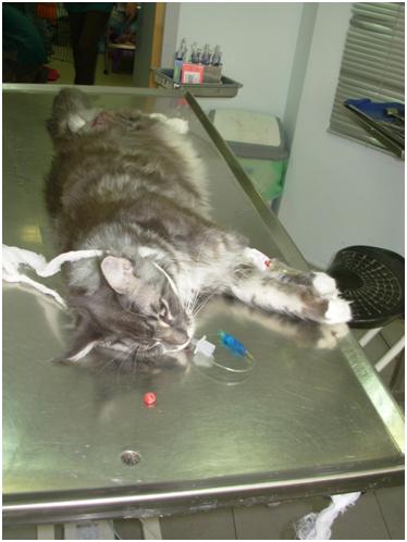 נילס בסוף הניתוח, ראש העצם לידו….ראו את היחס בין השולחן (מטר וחצי) לחתול…לעצם.